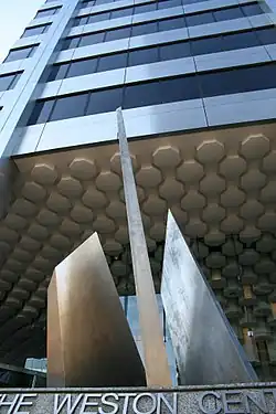 From the 1980s on, Smith created more than thirty public artworks commissioned by important institutions in Canada and the United States.[2] In 1980, Bell Canada commissioned him to create a large-scale bronze sculpture.[10] This sculpture, entitled Icarus, is permanently installed near Albert Campbell Square at the Scarborough Civic Centre.[11] Another monumental piece, Sails, was made of stainless steel and commissioned by George Weston Limited.[12] The abstract piece sits between two flights of steps at the front of Weston Centre (Toronto) and consists of three welded steel panels angled like the sails of a boat experiencing strong winds.[13] The inscription on the sculpture reads "'Tis the set of her sails and not the gales that determines the way she goes".[13]