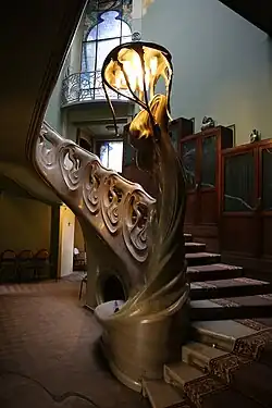 The plan of the interior was organized around a central element; the three-story staircase. The major rooms of the house all open onto the stairway. Its main feature is the highly sculptural stairway the railing of which is made of an aggregate of cast concrete mixed with marble and granite fragments, highly polished. The smooth, curling forms suggest waves of the sea. The glass and brass lamp at the base of the staircase is pure Art Nouveau. It takes the form of a medusa or jellyfish, and seems to float above the staircase. A red marble column emphasises the verticality of the staircase. It rises to the top of the house to the central skylight. Its capital is decorated with sculpted snakes and other reptiles.