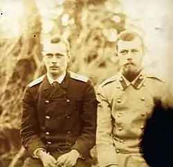 George was considered to be the most clever of the Imperial children and outgoing like his mother.[4] George and Nicholas shared the same tutors but studied in adjoining rooms. They followed the course of the Academy of the Russian General Staff, their tutors being distinguished professors. Their English teacher, Charles Heath, had once been tutor to their uncles, Grand Dukes Sergei and Pavel. Both brothers spoke and wrote perfect English. From Mr. Heath they acquired a love of sport, particularly shooting and fly-fishing. They also spoke fluent French and passable German and Danish.[4] George displayed signs of a promising career in the Navy before falling ill with tuberculosis in 1890.[5]