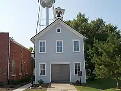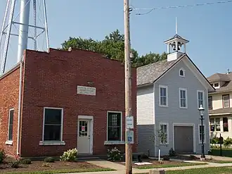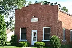 The former town hall is a two-story frame structure with a gable front. It was designed by Gustav Ahlff, who owned a local lumber yard, weigh station, and clay tile manufacturing company.[2] It is a 20 by 32 feet (6.1 by 9.8 m) structure. The main facade is three bays wide. The first floor features a central garage door that is flanked by two windows. The second floor has three windows that match those on the first floor. The entrance to the upstairs is on the south side of the east elevation. The building is capped with a belfry with a bell. The original bell is now part of a monument located in front of the pump house. The interior of the building features a single room on each floor, and a stairway at the back of the building. It is thought that an area on the main floors southwest corner may have been the location of an early jail that consisted of a single cell.