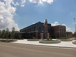 The university's main and original campus in Allendale is the site of most of the university's programs. The Allendale campus is composed of 1,322 acres perched above the Grand River next to a system of ravines and is divided into two areas, north and south campus, separated by West Campus Drive.[28][29] State highway M-45 links the campus in suburban Allendale to US Highway 31/Lake Michigan to the west and Grand Rapids, Michigan to the east. Lubbers Stadium, the GVSU Fieldhouse and all other athletic facilities for the school's 20 varsity sports are also on the Allendale campus. The campus is dotted with many sculptures, including works by Dale Eldred and James Clover. Academic facilities on the Allendale campus includes at least 122 classrooms, 144 research laboratories, 20 lab prep rooms, 21 computer labs, and the Mary Idema Pew Library Learning and Information Commons.[30] The Allendale campus is also home to the Kindschi Hall of Science, a science facility that opened in the fall of 2015.[31]