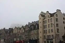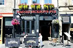 As a gathering point for market traders and cattle drovers, the Grassmarket was traditionally a place of taverns, hostelries and temporary lodgings, a fact still reflected in the use of some of the surrounding buildings. In the late 18th century the fly coach to London, via Dumfries and Carlisle, set out from an inn at the Cowgate Head at the eastern end of the market place.[4] In 1803 William and Dorothy Wordsworth took rooms at the White Hart Inn, where the poet Robert Burns had stayed during his last visit to Edinburgh in 1791. In her account of the visit, Recollections of a Tour Made in Scotland, A. D. 1803, Dorothy described it as "not noisy, and tolerably cheap".[5] In his 1961 film Greyfriars Bobby Walt Disney chose a lodging in the Grassmarket as the place where the Skye terrier's owner dies (depicting him as a shepherd hoping to be hired at the market rather than the real-life dog's owner, police night watchman John Gray).