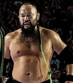 In September, O-Khan made his debut for Pro Wrestling Noah, teaming with The Great Muta and Nosawa Rongai to defeat Kongo (Tadasuke, Manabu Soya and Kenoh), at the finals of the N-1 Victory.[24] In October, O-Khan competed in a tournament to crown, the inaugural NJPW World Television Champion. O-Khan lost in the first round to Toru Yano, following being misted by The Great Muta.[25] The following month, O-Khan once again teamed with Aaron Henare in the World Tag League, finishing with 10 points, failing to advance to the tournament finals.[26][27] On December 17, O-Khan returned to RevPro winning the Undisputed British Heavyweight Championship, defeating Zak Zodiac, who was replacing champion Ricky Knight Jr.[28]