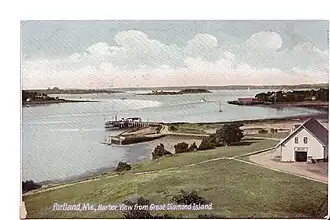 Great Diamond Island used to be named Great Hog Island.[3] Diamond Cove was initially an artistic retreat community, hosting visitors such as Henry Wadsworth Longfellow and Harriet Beecher Stowe, and it included amenities including a nine-hole golf course. At the time of the Spanish–American War, the island was converted almost entirely to a military base to defend Casco Bay. Fort McKinley was constructed between 1891 and 1907 and remained in service until the end of World War II in 1945. The property at Diamond Cove remained abandoned for decades, until its renovation to the community it is today.[4]