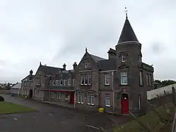Plans to reach fishing ports at Macduff and Banff from Inverurie were proposed when the Great North was first suggested, but failed because of the lack of financial support. A different route, from Milton Inveramsay, allowed for a shorter route with easier gradients. Unable to raise sufficient money for a line to the coast, a shorter 18-mile (29 km) line to Turriff was built. The Great North invested in the railway, and directors sat on the board of the Junction Railway. The new line, together with a junction station at Inveramsay, opened on 5 September 1857.[30] A separate company, the Banff, Macduff and Turriff Extension Railway, built an extension to a station called Banff and Macduff. The line was operated by the Great North from 4 June 1860,[31] and served an inconvenient terminus high on a hill 3⁄4 mile (1.2 km) from Macduff and 1⁄4 mile (400 m) from the bridge across the River Deveron to Banff. Four trains a day ran from Inveramsay, taking between 1 hour 30 minutes and 1 hour 50 minutes, with connections with services to Aberdeen.[32] Both railways were absorbed by the Great North of Scotland Railway on 1 August 1866,[27] and the line was extended 1⁄2 mile (800 m) to a new Macduff station in 1872.[33]
