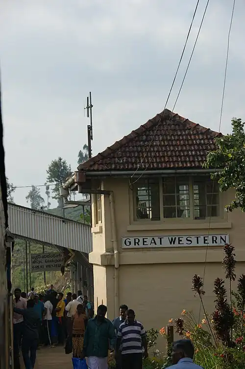 The railway station was constructed to service the Great Western Estate, a 628 ha (1,550 acres) tea plantation in the foothills of the Great Western Mountain. The estate was originally established by J. A. Rossiter in 1866.[3][4] In 1883 the estate was predominately a coffee plantation owned and operated by Dent Brothers & Co.[5] In 1893 following the construction of the railway station the ownership of the estate was transferred to the Great Western Tea Company of Ceyon, Ltd.[6]