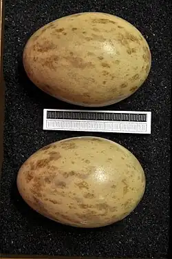 One to three olive or tan coloured, glossy eggs (two eggs being the average) are laid by the female in May or June. The nests, which are shallow scrapes made by the female on dry, soft slopes and plains, are usually situated close to the prior lek location. Nests are situated in sparse clusters, with a study in Inner Mongolia finding nests at a minimal 9 m (30 ft) apart from each other. In the same study, nests were placed at mid-elevation on a hill, at about 190 to 230 m (620 to 750 ft). Nesting sites are typically in dense grassy vegetation about 15 to 35 cm (5.9 to 13.8 in), likely for protection against predation, with extensive exposure to sunlight.[42] Eggs weigh about 150 g (5.3 oz) and are on average 79.4 mm (3.13 in) tall by 56.8 mm (2.24 in) wide. The female incubates the eggs alone for 21 to 28 days. The chicks almost immediately leave the nest after they hatch, although they do not move very far from their mother until they are at least 1 year old. Young great bustards begin developing their adult plumage at about 2 months, and begin to develop flying skills at the same time. They practice by stretching, running, flapping, and making small hops and jumps to get airborne. By three months they are able to fly reasonable distances. If threatened, the young stand still, using their downy plumage, mainly sepia in colour with paler buffy streaks, as camouflage. Juveniles are independent by their first winter, but normally stay with their mother until the next breeding season. Males usually start to mate from 5 to 6 years of age, although may engage in breeding display behaviour at a younger age. Females usually first breed at 2 to 3 years old.[3][41]