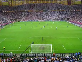 For the first time in history the final was a repeat of the opening match, with Greece and hosts Portugal facing off in a rematch. In the 57th minute Charisteas gave Greece the lead with a header from a corner by Angelos Basinas.[25] Portugal had much of the possession, but the Greece defence was solid and dealt with most attacks. Cristiano Ronaldo had a good chance to equalise in the dying moments, but could not apply a finish. Greece held on to win 1–0, winning the tournament, an achievement considered by many to be one of the greatest football upsets in history, if not the greatest.[26][27][28] Greece captain Zagorakis was named the player of the tournament, having led Greece and made the most tackles in the entire tournament.[29]