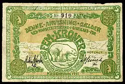 The Greenlandic krone (Greenlandic: koruuni, Danish: grønlandsk krone) was a planned currency for Greenland, plans of which were abandoned in 2009.[2] The same name is often used for currency issued during Greenland's time as a Danish colony. The name krone is derived from the Danish krone, introduced in an 1873 currency reform that replaced Danish mark and skilling.