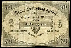In 1874, Handelsstederne i Grønland issued 50-øre and 1-krone notes, followed by 25-øre notes the next year. In 1887, 5-kroner notes were introduced. The Handelsstederne continued to issue notes until 1905. In 1911, the Kongelige Grønlandske Handel began issuing paper money, with notes in denominations of 25 and 50 øre, 1 and 5 kroner.