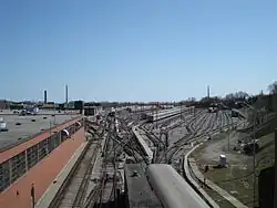 When it opened, the yard had a railway siding and some four rail, dual gauge (4 ft 10+7⁄8 in or 1,495 mm and 1,435 mm or 4 ft 8+1⁄2 in standard gauge) track for the delivery of subway cars from the manufacturer.[4] However, circa 2013, the TTC removed the standard gauge track to make more room for subway car storage.[7] As of 2016, the standard gauge siding had been severed from both the yard and the railway mainline.[8]
