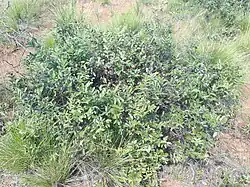 It grows as a spreading bush or small tree that can grow up to 5 m high. The young branchlets are hairy at first, later becoming hairless. The leaves are up to 7 cm long, rather dark green above and lighter below, with whitish or pale brownish hairs. An important distinguishing feature is the fruit, which can be found between January and April. It is hairy, about 1 cm in diameter and deeply 4-lobed. The flowers are yellow and found between October and December in axillary, 3-flowered groups on stalks up to 1.5 cm long.[4]
