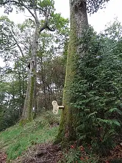 A series of clockwork keys appeared throughout the Ridding Wood trail, in the Grizedale Forest, UK in October 2011. Each key, when turned, generated a music box melody, that can be heard coming from the branches. A permanent work, it was commissioned by the National Forestry Commission.