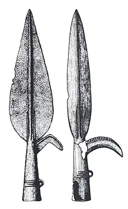 Several of the Shang dynasty artifacts of the Yin Ruins and from the tomb of Fu Hao (died c. 1200 BCE), excavated in Shang capital of Anyang, are similar to Seima-Turbino culture artifacts, such as socketed spearheads with a single side hook, jade figurines and knives with deer-headed pommel.[37] These Late Shang artifacts, visibly derived from the Seima-Turbino culture to the north, were made precisely at the same time the Shang reported intense protracted conflicts with the northern tribes of the "Guifang". Their century-long conflict with the Shang led to the transfer of various object and manufacturing techniques.[37][41]