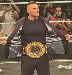 It was reported in November 2018 that Walter had signed an unspecified deal with WWE, and was assigned to the NXT UK brand.[64] Two months later, on 12 January 2019 at NXT UK TakeOver: Blackpool, Walter made his surprise debut by confronting WWE United Kingdom Champion Pete Dunne and attacking defeated challenger Joe Coffey.[65] He defeated Dunne for the title three months later at NXT TakeOver: New York.[66] During his time in NXT UK, he joined Fabian Aichner, Dieter Jr. (who had now gone by his real name Marcel Barthel) and Tischer (now under Alexander Wolfe) as Imperium,[67] reuniting Ringkampf under the new name .[68]