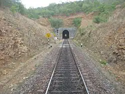 The Krishna Canal-Nandyal (KCC-NDL) stretch was a part of the important east–west coast link that connected Margao in Goa to Masulipatnam in the erstwhile Madras Province of British India. It was originally built to Metre Gauge by the Southern Mahratta Railway (later the Madras and Southern Mahratta Railway-MSMR) during 1889–90.[6] The track passed through the Nallamala Hills and as a result quite a few major engineering works were undertaken in the course of the railroad construction, the most impressive of them being the massive Dorabavi Viaduct[7] and the Bogada Tunnel, both of them about 30 km from Nandyal. This section was converted to Broad Gauge during 1993–95. The gauge conversion was a difficult task owing to the difficult terrain. The old alignment between Gazulapalli and Diguvametta was abandoned and a new Bogada tunnel, about 1.6 km in length and a new Dorabavi Viaduct located at a much lower altitude were constructed at a huge expense. The railway passes through the historic Cumbum Tank, starting from Cumbum railway station and spread over an area of 7 km. It is one of the most picturesque valleys in Guntur-Nandyal section of South Central Railway.[8]