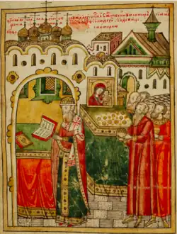 ![]() Depiction of Archbishop Gury during a service with Our Lady of Kazan (17th century) | |