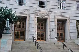 After completion, the building housed both the United States District Court for the District of Oregon and the United States Court of Appeals for the Ninth Circuit Portland duty station.[3] The Ninth Circuit moved to the nearby Pioneer Courthouse in 1973, and the District Court left for the new Hatfield Federal Courthouse in 1997.[3] In 1988, the courthouse was renamed in honor of judge Gus J. Solomon after he died in 1987.[3][5] In 1979, the courthouse was added to the National Register of Historic Places. Until 1984 the building also housed a post office on the first floor and in the basement.[2] This space was then remodeled for use by the District Court.[2] In 2004, with the remodeling of the Pioneer Courthouse and removal of the post office at that location, a postal branch was re-opened at the Solomon Courthouse.[6] In the mid-1990s the Multnomah County Court explored the possibility of leasing the courthouse from the federal government to use in addition to the Multnomah County Courthouse, but the plans were later canceled.[4]