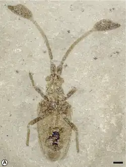 - ^ a b c d e f g h i Wappler, T.; Guilbert, E.; Labandeira, C.C.; Hörnschemeyer, T.; Wedmann, S. (2015). "Morphological and Behavioral Convergence in Extinct and Extant Bugs: The Systematics and Biology of a New Unusual Fossil Lace Bug from the Eocene". PLOS ONE. 10 (8): 1–17. Bibcode:2015PLoSO..1033330W. doi:10.1371/journal.pone.0133330. PMC 4534043. PMID 26267108.