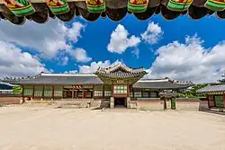 | Sujeongjeon (수정전; 修政殿; Sujŏngjŏn; 'Skillful Statecraft Hall'[143]) A building used by various government offices over time, and a designated Treasure.[144] It was a key facility involved in the invention of Hangul. It was destroyed in 1592 and rebuilt in 1867.[145] This form of the building has largely persisted to the present.[146] From 1966[147] to 1975,[146] it was occupied by a predecessor to the National Folk Museum.[147] Unusually for a side hall, it has a large wŏltae.[148] It has rear chimneys, which likely allowed for the use of ondol heated floors.[146] |