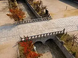 | Yeongjegyo (영제교; 永濟橋; Yŏngjegyo) A kŭmch'ŏn'gyo (bridge over a kŭmch'ŏn) to the north of Gwanghwamun. It passes over the stream Myeongdangsu and is made of stone.[122] Passing the bridge was seen as ceremonially entering the inner sanctum of the palace.[123] It was likely completed in 1395.[122] It was named in 1426.[124] In 1916, during the construction of the Government-General of Chōsen Building,[125] Yeongjegyo was disassembled and its remains moved to the west of the Government-General Museum of Chōsen. In the 1950s, it was installed in front of Sujeongjeon. It was again moved to the west of Geonchunmun in the 1970s.[126] It was restored to its original location in 1996,[127] 1997,[128] or 2001.[122] It is around 10 m (33 ft) wide and 13 m (43 ft) long.[126] |