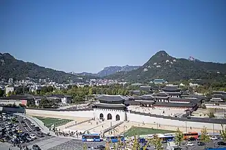 The placement of both Gyeongbokgung and Hanyang considered both practicality and various philosophical traditions.[84] The capital needed to have good access to water transportation, adequate spaces for roads to the rest of Korea, and adequate space for farming.[85] For philosophical traditions, one factor used from the Chinese text Rites of Zhou was placing the ancestral temple on the left, and soil and grain temple on the right. Accordingly, Jongmyo is to the left of the palace and Sajikdan to the right.[86] Another factor from the Rites was placing government offices to the front of the palace and markets to the rear; only the offices were able to be placed like so, as there wasn't enough room behind the palace for markets.[87] Feng shui was also considered. The flow of Korea's mountains and watersheds was analyzed, with one goal being to have the palace with a mountain behind it and water to the front. This corresponds to Bugaksan, Cheonggyecheon, and the Han River.[88] The presence of four surrounding major mountains (Bugaksan, Naksan, Inwangsan, and Namsan[b]) in Hanyang was seen as auspicious and protecting the city. Hanyang also had an outer ring of surrounding mountains (Bukhansan, Achasan, Gwanaksan, and Deogyangsan[c]), adding to its auspiciousness.[89] Contemporary Korean Buddhist monks then considered the convergence point of three mountains and two rivers to be auspicious sites: Hanyang had Samgaksan, Yongmunsan, and Gwanaksan and the confluence of the rivers Bukhan and Namhan.[91]