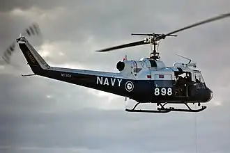 A RAN Bell UH-1B Huey VH-NVV hovering at NAS Nowra in January 1996 on the occasion of the 1996 Air Day at HMAS Albatross.