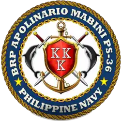 BRP Apolinario Mabini (PS-36) is the second ship of the Jacinto-class corvettes currently assigned to the Offshore Combat Force of the Philippine Fleet. She is one of few ships in the Philippine Navy equipped with modern systems after the completion of combat, navigation and weapon systems upgrade of her class in August 2019.[4] She is named after Apolinario Mabini, a hero of the Philippine revolution and a former prime minister. She was originally called HMS Plover (P240) during her service with the Royal Navy.
