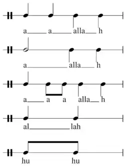 For those who perform it, the haḍra marks the climax of the Sufi's gathering regardless of any teaching or formal structure – it often follows a formal teaching session as a way of internalizing the lessons. Musically, the structure of the haḍra includes several secular Arab genres (each of which expresses a different emotion) and can last for hours.[1] It is directed by the sheikh of the tariqa or one of his representatives; monitoring the intensity, depth and duration of the phases of the haḍra, the sheikh aims to draw the circle into deep awareness of God and away from the participants own individuatedness.