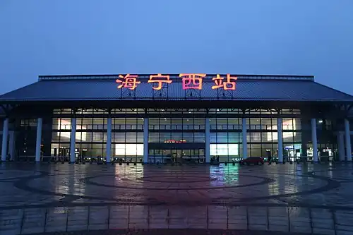 Hainingxi (Haining West) railway station (simplified Chinese: 海宁西站; traditional Chinese: 海寧西站; pinyin: Hǎiníng xī zhàn) is a railway station on the Shanghai–Hangzhou high-speed railway located in Haining, Jiaxing, Zhejiang, China. It opened on 26 October 2010,[1] ushering in the era of high-speed rail in Haining.[2]