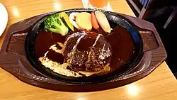 Hamburg (ハンバーグ, hanbāgu; Hamburg steak)[13] is a popular dish in Japan. It is made from ground meat with finely chopped onion, egg, and breadcrumbs flavored with various spices, and made into a flat, oval shape about 4 cm thick and 10 to 15 cm in diameter. Many restaurants specialize in various styles of Hamburg steak.[14] Some variations include hanbāgu topped with cheese (チーズハンバーグ, or chīzuhanbāgu), hanbāgu with Japanese curry, and Italian hanbāgu (with tomato sauce rather than demi-glace). In Japan, it is more commonly made from a mixture of ground pork and ground beef (called aibikiniku in Japan). If only beef is used instead of pork, the restaurant will usually indicate this.