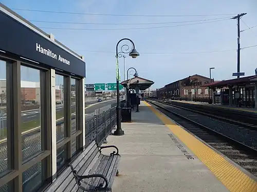 Hamilton Avenue station is a station on the River Line light rail system, located on Hamilton Avenue in Trenton, New Jersey. The station opened on March 15, 2004.[1] Southbound service from the station is available to Camden, New Jersey. Northbound service is available to the Trenton Rail Station with connections to New Jersey Transit trains to New York City, SEPTA trains to Philadelphia, Pennsylvania, and Amtrak trains. Transfer to the PATCO Speedline is available at the Walter Rand Transportation Center.