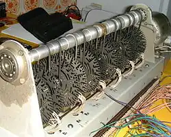 The basic component sound of a Hammond organ comes from a tonewheel. Each one rotates in front of an electromagnetic pickup. The variation in the magnetic field induces a small alternating current at a particular frequency, which represents a signal similar to a sine wave. When a key is pressed on the organ, it completes a circuit of nine electrical switches, which are linked to the drawbars. The position of the drawbars, combined with the switches selected by the key pressed, determines which tonewheels are allowed to sound.[106][107][108] Every tonewheel is connected to a synchronous motor via a system of gears, which ensures that each note remains at a constant relative pitch to every other.[109]