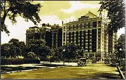 The Sisson Hotel, was constructed in 1918 on the site of Paul Cornell’s first Hyde Park House hotel opened in 1857, which had been destroyed by fire in 1879 at Lake Michigan and 53rd Street. It is credited as the first high rise on the South Side of Chicago excluding buildings associated with the World's Columbian Exposition. It was constructed adjacent to Lake Michigan before the landfill projects that moved the shoreline eastward and eventually cleared the way for the construction of Lake Shore Drive. In 1923, proprietor Harry W. Sisson was linked to the Ku Klux Klan by the American Unity League, which resulted in a boycott by Catholics and Jews. The reaction was a movement to urge Klansmen to stay at the hotel.[1]