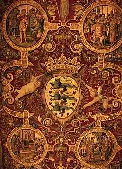 When this series was completed in 1585, the king commissioned Knieper to make the Throne Baldaquin. The Throne Baldaquin was made of 8 separate tapestry pieces which were woven with silver, gold and silk. It was intended to hang above the heads of the king and queen when they sat at the head of the banquet table.[4] Its rich materials and distinguished and refined style make it probably Northern Europe's most beautiful piece of fabric. It was completed in 1586 and was in 1659 taken by the Swedes as war loot after they sacked Kronborg. It remained in the Swedish royal family until after Karl XV's death it was transferred to the State and is now in the Nationalmuseum in Stockholm.[5]