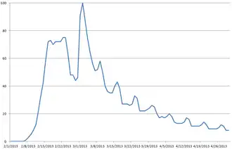 On February 10, 2013, the upload rate of Harlem Shake videos reached 4,000 per day, or one every 21.6 seconds.[22] As of February 11, about 12,000 versions of the popular Internet meme had been uploaded to YouTube, garnering over 44 million unique views. By February 15, about 40,000 Harlem Shake spinoff videos had been uploaded, generating over 700 million views.[3][23] On February 26, 2013, the trend created by the YouTube creator TooTurntTony led to the suspension of over a dozen students at Milford High School (Michigan).[24]