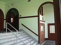 The Hartington City Hall and Auditorium includes three levels: raised basement partially below grade, main level, and upper level. The basement level and main level are basically rectangular in plan, 75 feet (23 meters) wide (north-south along Broadway) and 130 feet (40 meters) front to back (east-west along Centre). However, the upper level plan is in the shape of a cross, so that the four corners are one story lower and function as wings. The two front wings project forward toward Broadway as well as laterally (north and south). The two rear wings are flush with the back (east) of the building. The southeast wing projects south and contains the two fire house doors, but the northeast wing does not project north. The basement originally contained the armory including officers’ quarters, lockers, supply room, and sleeping facilities for fire fighters, with the firehouse in back under the auditorium stage. The main level accommodated the lobby and city offices in front, the auditorium's hardwood floor taking up the large middle, and the stage in back above the fire house. The cross-shaped upper level included a small space in front above the lobby and the stage fly space in back, but the bulk of it in the middle was simply open to the auditorium.[19][21][23]