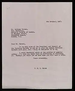 Started in 1875, an annual lecture is given in honour of William Harvey. Past speakers have included surgeon (and brother of economist John Maynard Keynes) Geoffrey Keynes, Nobel Prize winners for work on penicillin Ernest Chain and Howard Florey, co-discoverer of DNA Francis Crick and heart transplant pioneer Christiaan Barnard.[5]