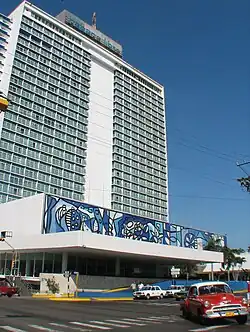 Originally known as the Hotel Habana Riviera, it is a historic resort hotel located on the Malecón waterfront boulevard in the Vedado district of Havana, Cuba. The hotel, which is managed by the Spanish Iberostar chain, was built in 1957 and still maintains its original 1950s style. It has twenty-one floors containing 352 rooms all of which feature views of the water and the Vedado neighborhood.
