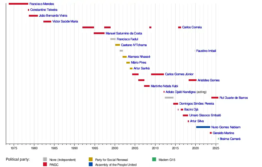 | 5 | | Carlos Correia (1933–2021) | 1994 | 27 December 1991 | 26 October 1994 | 2 years, 303 days | PAIGC |