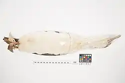 The Heard Island shag has largely black upperparts and white underparts. The cheeks and ear-coverts are white; there are white bars on the wings, a black, recurved crest over the forehead, and pink feet.[2] A breeding adult has a pair of orange caruncles above the base of the bill in front of the eyes as well as blue eye-rings.[2] It is about 77 cm in length, with a wingspan of 120 cm and a weight of 3 kg.[2]