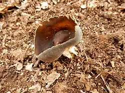 The fruiting bodies consist of a stalked, cup- to saucer-shaped apothecium that often becomes laterally compressed with age, measuring 2.5–5 centimetres (1–2 in) across. The spore-bearing surface, or hymenium, is smooth and dark greyish-brown to brownish-black, contrasting subtly with the outer receptacle, which is the same colour or slightly paler and is finely downy (pubescent). Supporting the cup is a distinct, hollow stipe 1.5–6 cm tall and 0.8–2 cm thick, coloured whitish to pale grey. The stipe bears three to six blunt ribs separated by grooves that continue seamlessly onto the base of the cup, giving the entire structure a subtly ribbed appearance.[4]