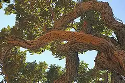 Native trees which dominate the park include valley oak (Quercus lobata), blue oak (Q. douglasii), coast live oak (Q. agrifolia), canyon live oak (Q. chrysolepis), interior live oak (Q. wislizenii), gray pine (Pinus sabiniana), ponderosa pine (P. ponderosa), Pacific madrone (Arbutus menziesii), California laurel (Umbellularia californica), California buckeye (Aesculus californica), white alder (Alnus rhombifolia), California juniper (Juniperus californica), blue elderberry (Sambucus mexicana) and California sycamore (Platanus racemosa). Big-berry Manzanita (Arctostaphylos glauca) reach remarkable size within the park (over 20 feet (6 m) tall) and can grow as either small trees or large shrubs. Other prominent shrubs and wildflowers include chamise (Adenostoma fasciculatum), toyon (Heteromeles arbutifolia), coyote brush (Baccharis pilularis), California sagebrush (Artemisia californica), eastwood manzanita (Arctostaphylos glandulosa), yerba santa (Eriodictyon californicum), buckbrush (Ceanothus cuneatus), California gooseberry (Ribes californicum), fuchsia-flowered gooseberry (Ribes speciosum), yellow mariposa lily (Calochortus luteus)[8] and mountain mahogany (Cercocarpus betuloides).