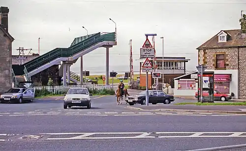 Hest Bank station itself was of rugged stone construction, a two-storey station house with a booking hall below on the up (southbound) platform. It was next to a level crossing over a minor road linking the A589 with houses, a water treatment works and a caravan park further along the foreshore. A small cottage for the crossing keeper was provided on the down (coastal-facing) side along with a footbridge to connect the platforms. The down side also had two sidings, one providing a bay platform.[2]