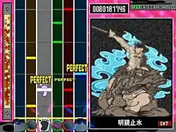 The interface is similar to other games in the Bemani series. Two note scrolls—one for each player—are displayed at the left and right sides of the screen. Colorful animations for each song are displayed in the center of the screen. Each note scroll consists of four columns: one each for the red, green, and blue buttons, and a fourth column, known as the Wailing Bonus column. Individual notes and chords are represented by small colored bars that scroll upward in the columns. To play the correct note, the player must hold down the buttons corresponding to the colored bars, and move the fret lever when the bars reach the yellow fretting line. When a guitar icon is displayed in the Wailing Bonus column along with an associated note, the player can tilt the guitar upright while playing the note to receive bonus points.