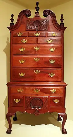 This high chest of drawers, also known as a highboy or tallboy, is part of the Decorative Arts collection of the Indianapolis Museum of Art in Indianapolis, Indiana. Made between 1760 and 1780 in Philadelphia, Pennsylvania, its design was inspired by British furniture-maker Thomas Chippendale.[1]