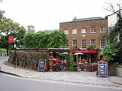 For centuries The Gatehouse pub at the northern end of the street marked the boundary between parishes of Hornsey and St Pancras. Today it marks the border between the boroughs of Camden and Haringey.[2] Buildings on the northern section of the road are on land taken from the old Highgate Green in the eighteenth century.[3] To the west is Highgate Reservoir, also constructed on land taken from the old green, with a pavilion dating back to 1845. The Flask pub is located at the junction with South Grove and has existed on the spot since the seventeenth century.