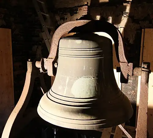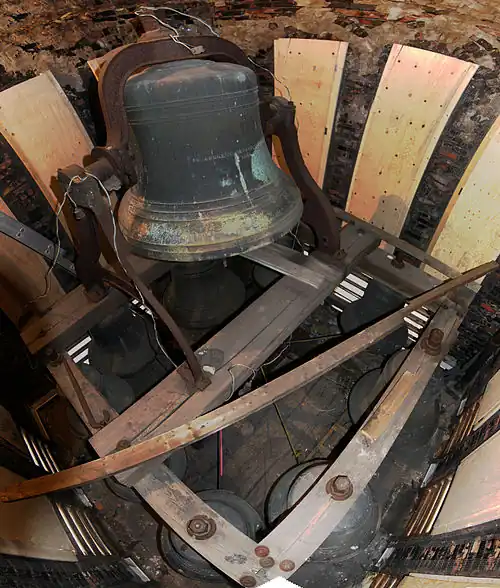 The bells are arranged as a traditional chime of 10 bells and are played from the ringing room immediately below the Bell Chamber in the bell tower using the original unmodified McShane "pump handle" chimestand with deep key-fall on all notes. The purely mechanical action makes it possible to play all dynamic gradations, from very soft to very loud. Nine of the bells are hung fixed in position in the main chime frame in the belfry, the tenth, the heaviest bell, is mounted in a rotary iron yoke on iron stands above the main chime frame. This bell, the tenor bell, is equipped with both a spring clapper and a tolling hammer so can be played either by swing chiming or by using the chimestand.
