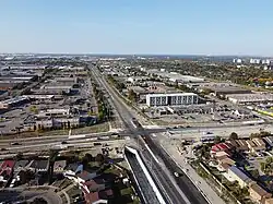 In the mid-1950s, the Toronto Bypass was constructed between Highway 2A and the Queen Elizabeth Way (QEW), widening Highway 27 to a four lane freeway in the process. This section was reconstructed again starting in 1968 and continuing until the early 1970s to turn it into a twelve-lane collector-express system. The junction with the QEW was built over 48.5 ha (120 acres) and required the construction of 19 bridges and the equivalent of 42 km (26 mi) of two lane roadway.[10] The junction with Highway 401 sprawls over 156 ha (385 acres) and required the construction of 28 bridges and the equivalent of 46.6 km (29 mi) of two lane roadway, the largest interchange in Canada.[11] The former was opened to traffic on November 14, 1969,[12] while the latter required several more years of construction staging, fully opening on December 4, 1971 (though portions were opened in the weeks prior to that), just prior to the renumbering of Highway 27 as Highway 427. The rest of the route was rebuilt prior to the completion of these interchanges. [13][14] In the new configuration, with Highway 27 being the continuation of Highway 427 collector lanes as they split off from the express lanes approaching Highway 401, Highway 27 received a half-cloverleaf interchange with Eglinton Avenue (originally meant for the never-built Richview Expressway), however Highway 27 lost its direct access to Highway 401 (although indirect access is available via Dixon Road). The isolated section of Highway 27 following Browns Line from south of the QEW to Lake Shore Boulevard (then Highway 2) was subsequently decommissioned.[15][16]