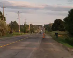 Through Etobicoke, it encountered mostly industrial surroundings, meeting Dixon Road at a cloverleaf interchange near the Toronto Congress Centre, then crossing (but not interchanging with) Highway 409. Highway 27 followed a mostly straight route throughout its length, as it passed through the suburb of Rexdale, then north of Kleinburg, with the vast majority of the highway being surrounded by rural farmland. Within Etobicoke, Highway 27 travelled along the 3rd Concession,[5] and in York Region followed the 9th Concession of Vaughan and King Township; both being approximately 16 km west of Yonge Street. It passed along the western edge of suburban sprawl in Vaughan, near the community of Woodbridge. South of Kleinburg, the highway dipped into the Humber River valley, connecting with Islington Avenue. North of the valley, it continued through King Township into the Oak Ridges Moraine, dividing the village of Nobleton and entering Schomberg immediately south of Highway 9, north of which the highway entered Simcoe County.[6][7]
